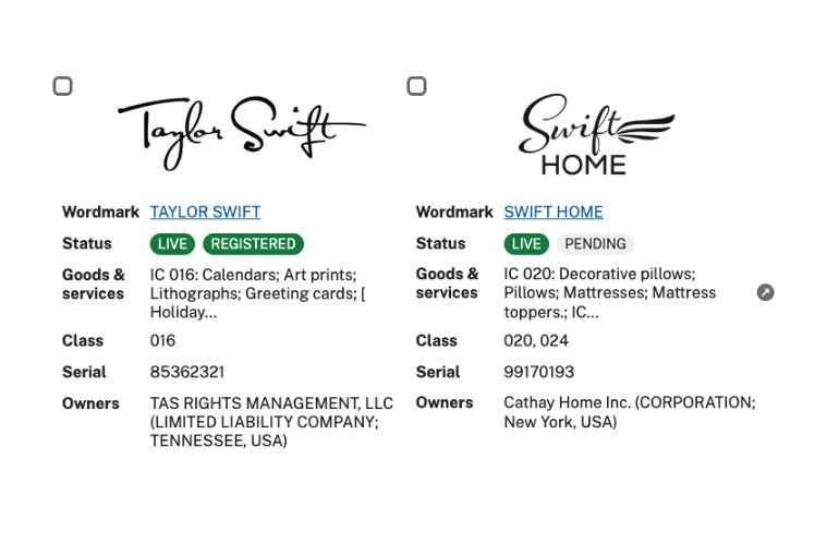Taylor Swift is asking the U.S. Patent and Trademark Office to stop a bedding company from registering a trademark for “Swift Home”, saying the name and styling could lead shoppers to assume the products are connected to her. Swift’s team argues the logo resembles her trademarked signature. What do you think? It's giving From Love Story to Court Story!